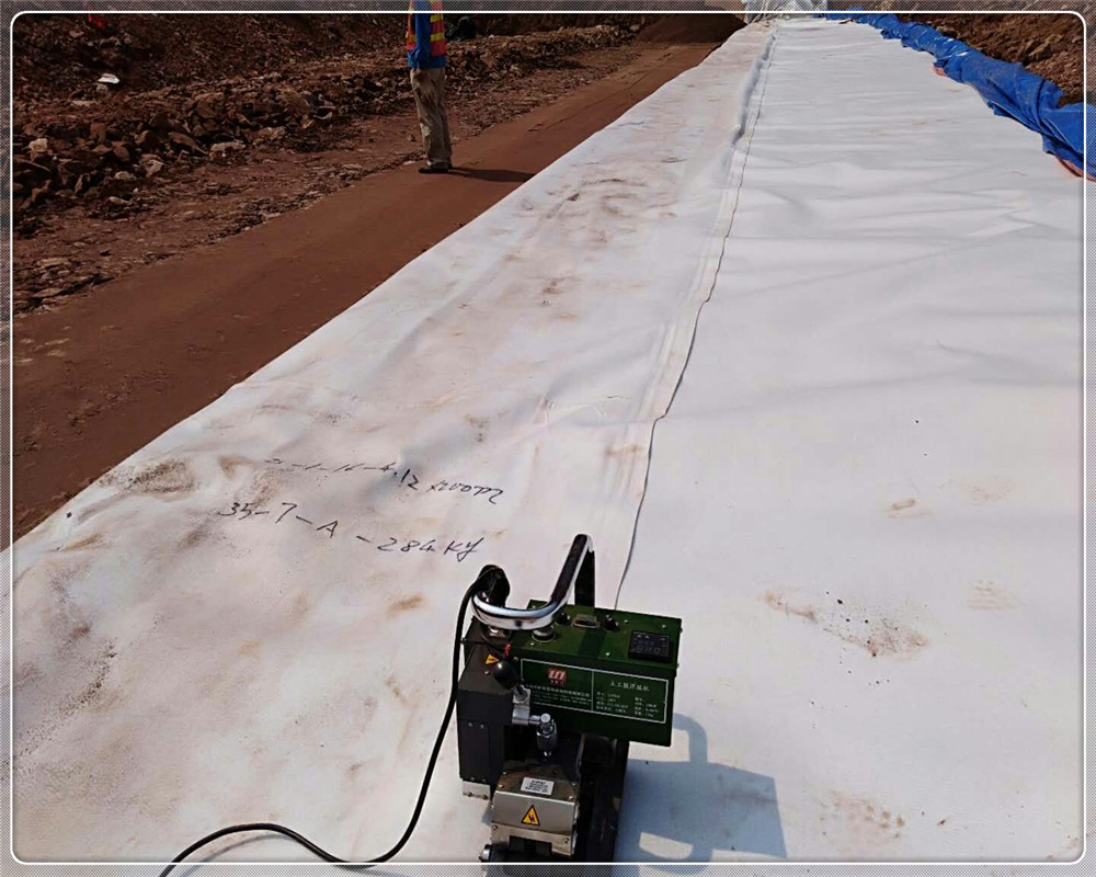 樞紐主要由復合土工膜堆石壩、溢洪道、引水發電系統、放空洞組成。復合土工膜堆石壩壩高85m,為高比例(達81%)軟巖填筑,軟巖填筑比例在同類型壩中世界之高。大壩防滲體采用復合土工膜防滲面板。土工膜之間的焊接和土工膜在錨帶部位的焊接,兩部位均采用熱風粘合的方式。土工膜與土工膜之間的焊接采用全自動風焊機進行,焊接帶的寬度為65mm,中間留有15mm的檢查氣孔,兩側各有25mm寬的粘合段。
